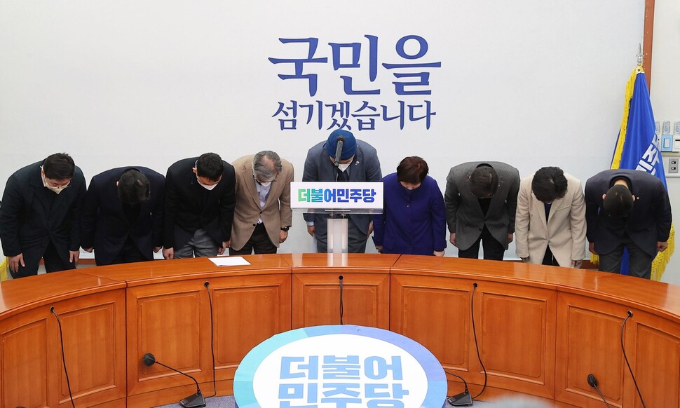 송영길 더불어민주당 대표 등 지도부가 10일 오후 서울 여의도 국회에서 열린 기자회견에서 고개 숙여 인사하고 있다.