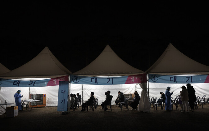 15일 오후 서울 마포구 월드컵공원 평화광장에 마련된 코로나19 임시 선별검사소에서 신속항원검사를 마친 시민들이 검사 결과를 기다리고 있다. 연합뉴스