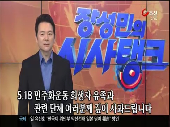 <TV조선> 시사프로그램 '장성민의 시사탱크' 진행자이던 장성민씨 모습. 그는 2013년 5월 22일 메인뉴스 '뉴스쇼 판'에 출연, "광주 민주화운동 희생자 유가족과 관련단체에 (북한군 개입설 방송을) 사과드린다"고 했다.