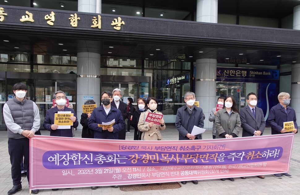 33개 기독교단체와 교회로 꾸려진 ‘강경민목사 부당면직 반대 공동대책위원회’(이하 강목사공대위)는 지난 21일 서울 종로구 연지동 한국기독교연합회관 앞에서 기자회견을 열어 “교단은 하루빨리 강 목사의 면직 처분을 취소하고 명예를 회복할 것”을 촉구했다.