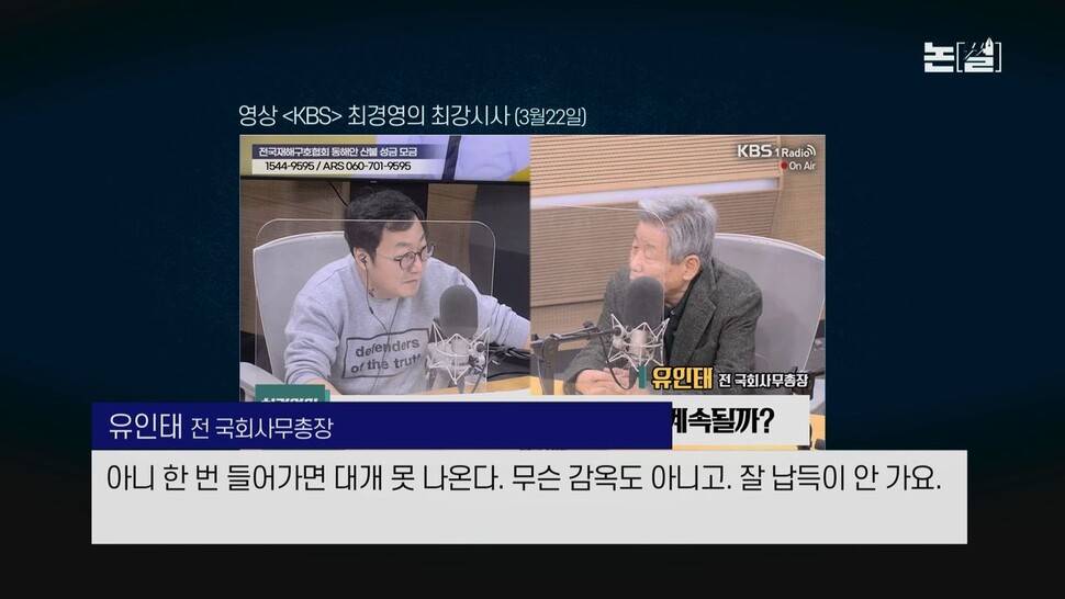 유인태 “네. 안 그러면 저렇게까지. (…) 이거 당선되자마자 이렇게 무리하는 걸 어떻게 해석해야 할지 다들 궁금해하지 않아요?”(유인태 전 국회 사무총장, 22일 KBS ‘최경영의 최강시사’)