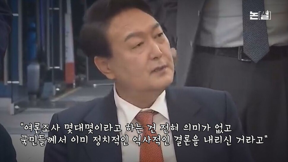 “그거는 뭐, 지금 여론조사를 해서 몇 대 몇이라고 하는 거는 의미가 없고. 국민들께서 이미 정치적인, 역사적인 결론은 내리신 거라고 저는 보고 있다.”(윤석열 당선자, 24일 약식 기자간담회)