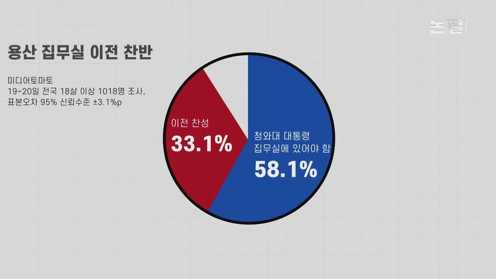 ‘제왕적 대통령’이 되지 않기 위해 청와대를 나오겠다는 의지에 동의하는 국민들 가운데도 국가 중대사인 만큼 일정 기간 청와대에 머물면서 제대로 준비한 뒤 이전을 추진하는 게 좋겠다는 의견이 적지 않습니다. 민생과 상관없는 집무실 이전이 시급한 현안들을 모두 빨아들이는 블랙홀이 돼버린 상황을 걱정하고 있는 것입니다.