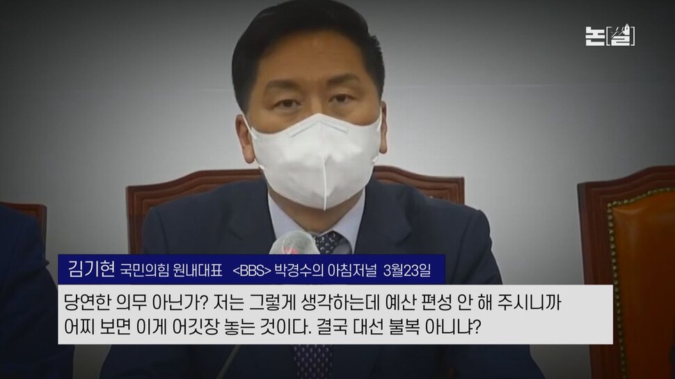 김기현 “이게 다른 곳으로 집무실을 옮기겠다고 한 것인데, 그 약속을 국민들이 믿고, 중요한 공약 중에 하나죠. 그래서 찍어주셨으면 지금 현 대통령은 그에 맞춰서 국민의 뜻에 따라서 예산을 편성해 주시는 것이 당연한 의무 아닌가? 저는 그렇게 생각하는데 예산 편성 안 해 주시니까 어찌 보면 이게 어깃장 놓는 것이다. 결국 대선 불복 아니냐? 이런 논란을 불러일으킬 수밖에 없는 거죠.”(김기현 국민의힘 원내대표, 23일 BBS ‘박경수의 아침저널’)