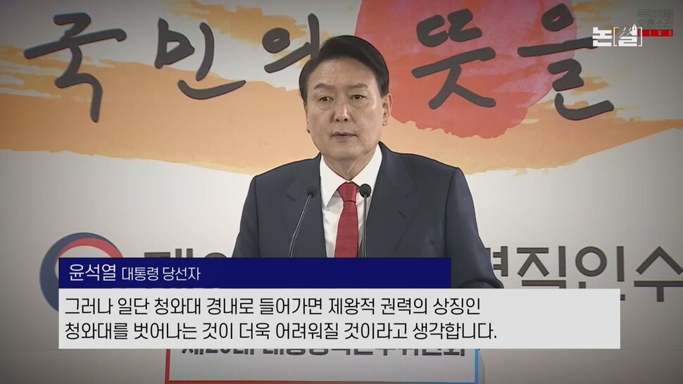“일단 청와대 경내로 들어가면 제왕적 권력의 상징인 청와대를 벗어나는 것이 더욱 어려워질 것이라고 판단했습니다.”(윤석열 당선자, 20일 기자회견)