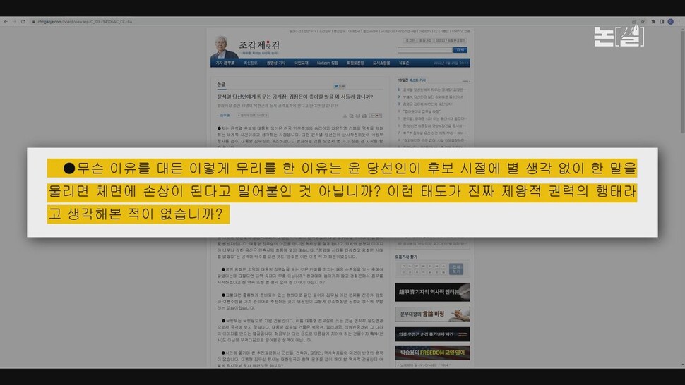 가령 보수 논객인 조갑제 <조갑제닷컴> 대표도 다음과 같이 반대 입장을 밝혔습니다. “무슨 이유를 대든 이렇게 무리를 한 이유는 윤 당선인이 후보 시절에 별 생각 없이 한 말을 물리면 체면에 손상이 된다고 밀어붙인 것 아니냐. 이런 태도가 진짜 제왕적 권력의 행태라고 생각해본 적이 없나.” 보수진영마저 윤 당선자가 억지를 부리는 것으로 보고 있음을 말해줍니다.