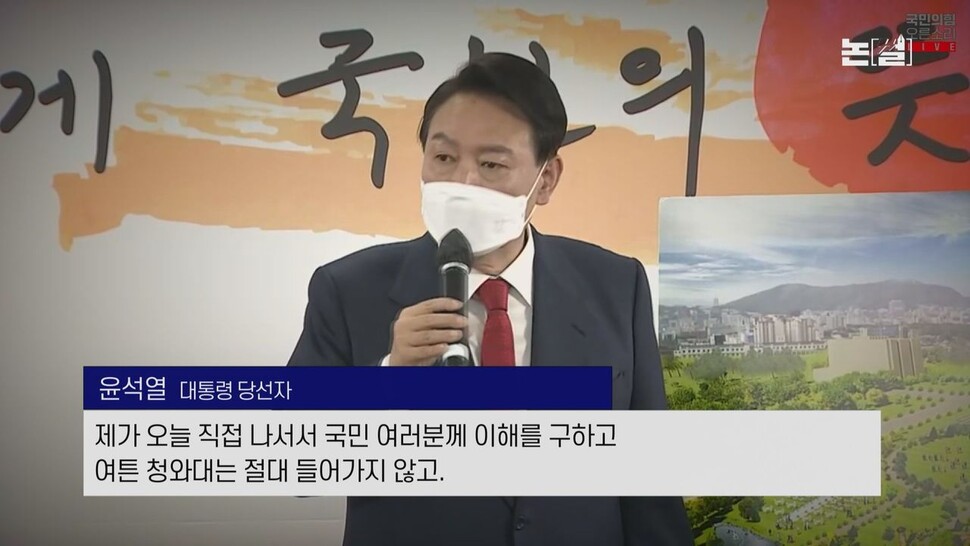 윤석열 “이 부분을 지금 여론조사를 해서 여론조사에 따라서 하는 것보다는 저는 어느 정도의 정부를 담당할 사람의 자기의 어떤 철학과 결단도 중요하다고 저는 보고 있고요. 이 시기를 갖다가 조금 더 시간을 좀 더 두고 판단하는 게 어떠냐 그랬는데, 그렇게 되고 청와대에 들어가면 저는 안 된다고 봅니다. 그래서 제가 오늘 이렇게 말씀을 드리는 겁니다. 국민들께서 조금 급한 거 아니냐 조금 더 시간을 갖고 봐야 되지 않느냐는 그런 우려의 말씀들이 있다는 걸 알기 때문에 제가 오늘 직접 나서서 국민 여러분께 이해를 구하고 청와대는 절대 돌아가지 않고.”(윤석열 당선자, 20일 기자회견)