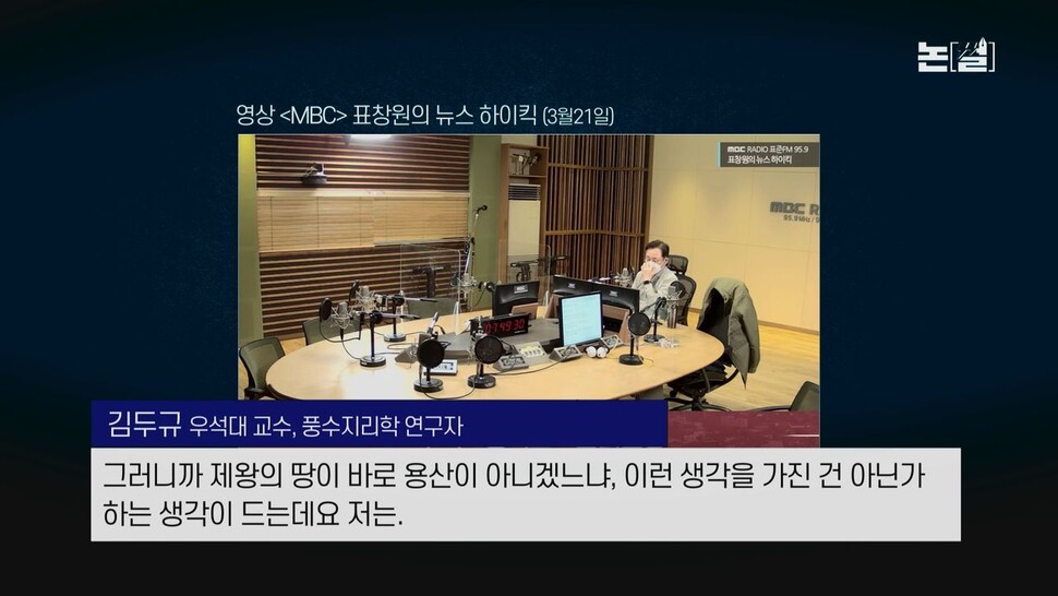 김두규 “글쎄요. 갑자기 너무 뜬금없는 것이어서 저도 약간 왜 그렇게 빨리 그쪽으로 한 것인가에 대해서, 예컨대 광화문 정부청사도 있고, 과천 뭐랄까 정부청사 및 공무원 교육 연수원도 있는데, 이쪽으로 한 것에 저는 좀 이해가 안 된 부분이 없지 않아 있었어요. 기자회견에 ‘공간이 의식을 지배한다’ 이런 발언도 하셨더군요. 공간이라는 건 터를 말하는 것 아닙니까? 땅이 공간을 말하는 것이 되고 그것이 사람 의식을 지배한다, 그럼 땅과 인간 간의 상관관계를 전제하는 것 아니겠습니까? 그렇다고 한다면 풍수를 믿어서 그리 갔다는 것인데, 용산이란 한자 ‘용’은 중국에서 임금을 뜻합니다. ‘산’도 임금을 뜻해요. 그러니까 제왕의 땅이 바로 용산이 아니겠느냐, 이런 생각을 가진 건 아닌가 하는 생각이 드는데요. 저는.”