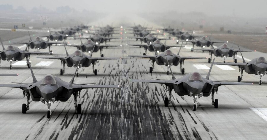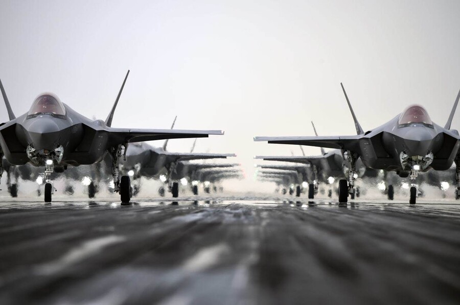 F-35A 스텔스 전투기 수십 여 대가 25일 오후 우리 군 공군기지에서 엘리펀트 워크(Elephant Walk) 훈련을 하고 있다.