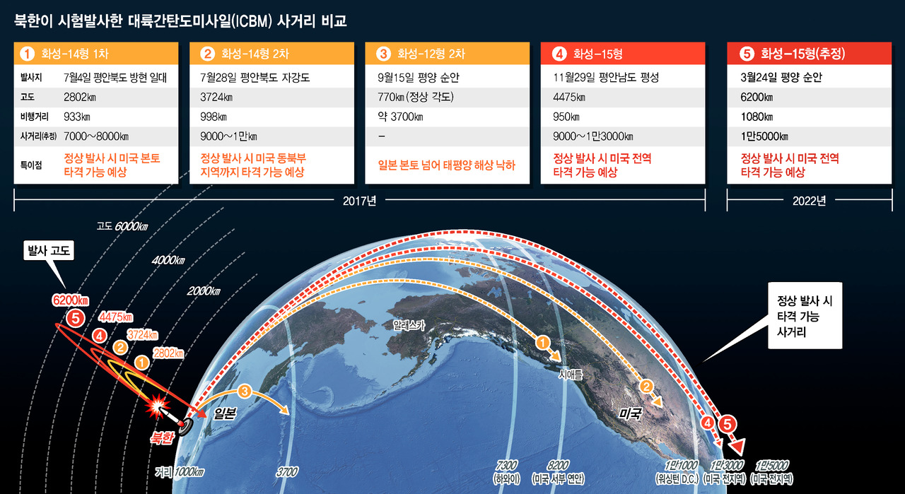 북한이 대륙간탄도미사일을 발사하며 레드라인을 넘어선 만큼, 향후 더 파괴력이 큰 도발에 들어갈 가능성이 높다는 게 대체적 평가다. 특히 한국의 정권 교체기를 틈탄 혼란 속 김일성 주석 탄생 기념일인 ‘태양절’과 한미연합 훈련이 예정된 4월 안팎에 추가적 도발에 나설 수도 있다는 것이다. 다만 북한이 이번에 발사한 대륙간탄도미사일이 일본 상공을 넘어가지 않은 점을 들어서, 북한 역시 아직은 여지를 남겨두고 있다는 분석도 나온다. 국제위기그룹의 한반도문제 선임연구원인 크리스토퍼 그린은 <월스트리트 저널>에 이번 발사가 기존보다 더 높이, 더 멀리 날아갔으나, 일본 상공을 넘어가지는 않았다는 것을 언급하며 “게임체인저는 아니다”라고 지적했다. 그는 “북한도 확실히 (이를) 의식하고 있다”고 지적했다.