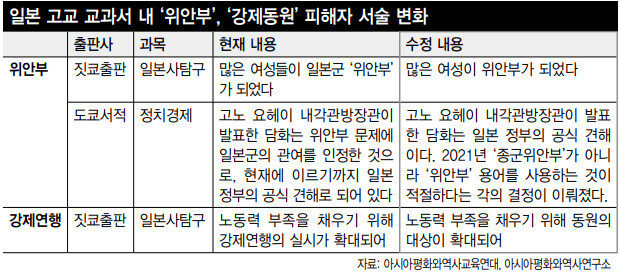 일본 정부의 지난해 4월 결정에 따라 내년부터 일본 고등학교 2학년 이상 학생이 사용하는 교과서에서 ‘종군 위안부’ 혹은 ‘일본군 위안부’라는 표현이 빠지게 됐다. 또, 조선인 강제동원 과정의 강제성을 강조하기 위해 사용됐던 ‘강제연행’이라는 표현도 모두 삭제됐다. 일본 정부가 이들 표현을 교과서에 쓰지 못하도록 막으면서, 일본 사회는 ‘역사 교육’을 통해 위안부 문제와 같은 잘못을 되풀이하지 않겠다는 1993년 ‘고노 담화’의 약속에서 결정적으로 멀어지게 됐다.