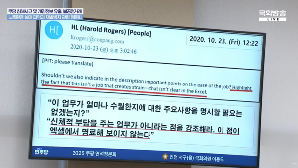 더불어민주당 이용우 의원(인천 서구을)은 2020년 10월 고용노동부가 장 씨의 산업재해 사고와 관련해 자료를 요구하자, 당시 쿠팡 수석부사장이었던 로저스 대표가 "신체적 부담을 주는 업무가 아니라는 점을 강조하라"고 지시한 내부 이메일을 공개했다. 이 의원이 문서를 제시하며 '무슨 의도냐'고 물었고, 로저스 대표는 "이 문서는 직장 내 괴롭힘으로 계약이 해지된 직원에 의해서 제출된 것"이라며 "이 문서의 진위 여부를 확인하지 못했다"고 회피성 답변을 했다.