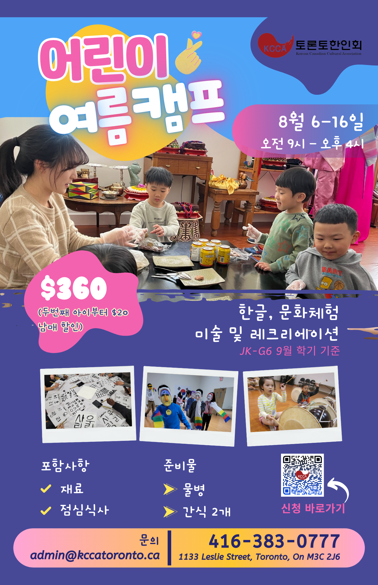 토론토 한인회(회장 김정희)는 여름방학 기간 JK~Gr6 사이 어린이를 대상으로 한국 문화와 레크리에이션 등 다양한 프로그램을 재미있게 익히고 체험할 수 있는 ‘2024 어린이 여름캠프’를 8월에 2주간 개설해 운영한다.