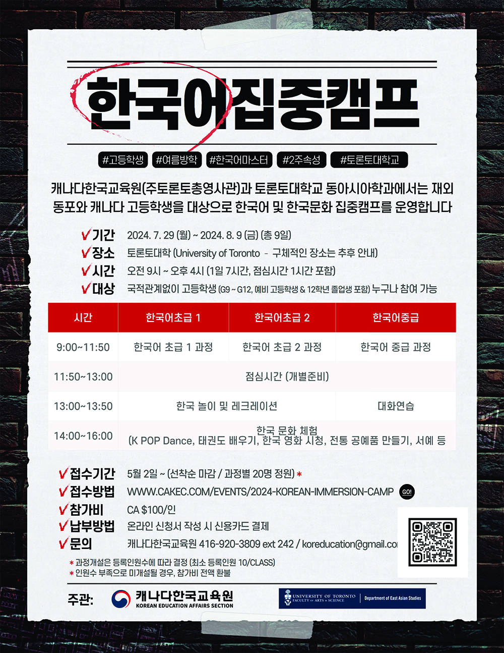토론토 총영사관 캐나다 한국교육원(원장 장지훈)은 토론토대학 동아시아 학과와 공동으로 ‘2024 여름방학 캐나다 고등학생 대상 한국어 집중 캠프’를 오는 7월29일부터 8월9일까지 2주간 토론토대학에서 개설해 운영한다.