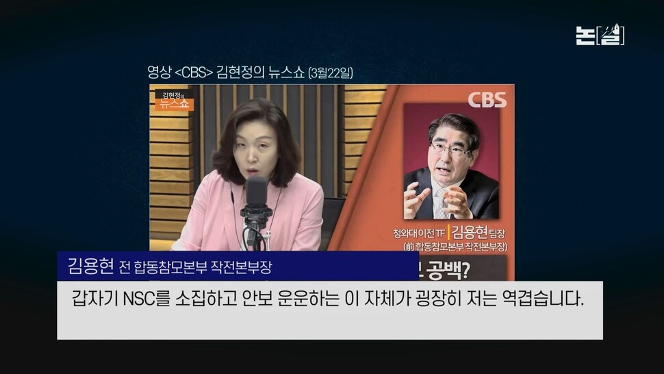 김용현 “네. 앞으로 협상의 여지가 있다는 것은 저도 충분히 공감이 되고요. 그동안 사실 수십 차례의 미사일 발사를 통해서, 도발을 통해서 우리 국민의 안전을 위협해 왔음에도 불구하고 이 정부가 도발을 도발이라 말하지 않았지 않습니까? 어떠한 대응도 내놓지 않았습니다. 그런 어떤 안보 위기상황에서도 NSC를 연 적도 없는 그분들이 어느 날 갑자기 방사포, 있지도 않은, 잘 확인도 안 되는 방사포 쐈다고 갑자기 NSC를 소집하고 안보 운운하는 이 자체가 굉장히 저는 역겹습니다. 좀. 이건 아닌 것 같아요.”