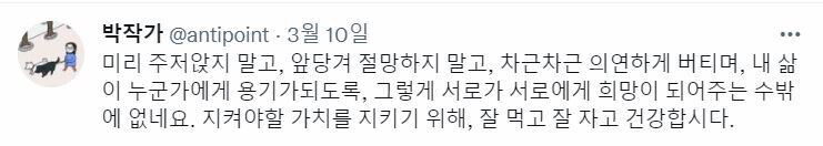박작가 “이번 대선의 과정과 결과를 지켜본 많은 양식 있는 사람들이 그렇듯이, 저 역시 손이 떨리고, 절망하고, 분노하고 무기력해지곤 했습니다. 그러나 결과가 결정나던 새벽 즈음에 그런 생각이 들었어요. 겨우 1%였다. 어쩌면 결과가 바뀌었을 수도 있는 수치였지만, 선거라는 게 늘 그렇듯 승과 패의 결과만 기억될 것이다. 겨우 1%의 차이로, 혐오를 막아내려고 애썼던 그 많은 표심이 패한 것인가? 우리가 우리 자신을, ‘패배자’로 정체화해도 되는가? 겨우 1%의 결과에 무릎 꺾여 무너져 내리는 것, 무기력하게 냉소하고, 혹은 함께 가야 할 사람들끼리 탓을 하며 싸우는 것, 이것이야말로 저들의 서사를 승리로 만들어주는 것이다. 그들은 선거에는 간신히 이겼지만, 내 삶의 서사까지 지배하지는 못할 것이다. 그렇게 만들어야겠다. 선거에는 졌지만, 삶의 서사에서는 지지 않을 것이다. 이런 생각이 들어서…. 서로에게 용기가 되자고, 서로에게 희망이 되자고, 선거결과가 우리의 미래까지 완전히 지배하지는 못하도록 정신을 차리자고 말하고 싶었던 것 같아요. 도움이 되었으면 좋겠습니다.”