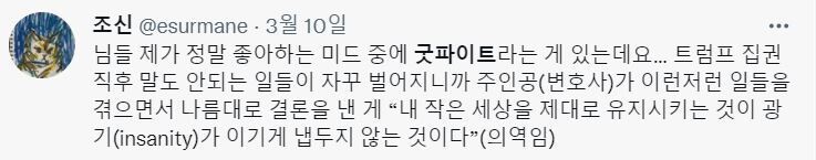 조신 “우선 트럼프 당선 과정과 그 후에 일어났던 일들이 떠올랐습니다. 그때처럼 사람들의 선택 기전이 이해가 가지 않았고, 비합리적으로 느껴졌습니다. 저와 같이 생각하는 사람들이 분명 있을 것이고, 당장은 절망적으로 느껴지고 앞날이 없는 것 같다고 생각할 수도 있지만 그게 아니다, 지지 말자는 마음에서 트윗을 작성했습니다.”