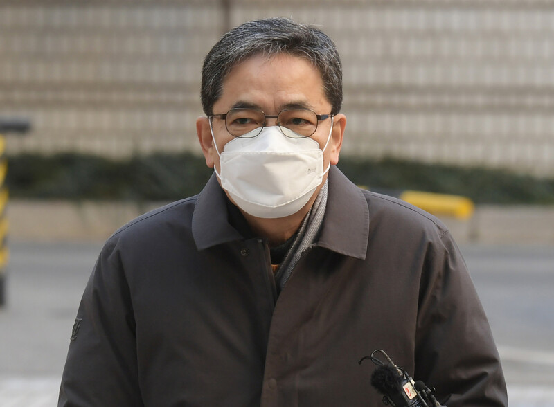 대장동 개발 사업자들의 편의를 봐준 대가로 수십억 원의 뇌물을 챙긴 혐의를 받는 곽상도 전 국민의힘 의원이 지난 4일 구속 전 피의자심문(영장실질심사)을 받기 위해 법원에 출석하고 있다. 연합뉴스.