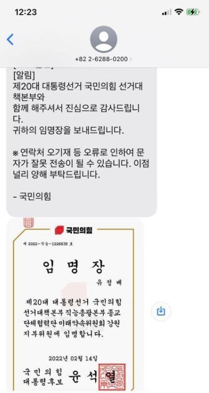 유정배 전 대한석탄공사 사장은 지난 14일 한 통의 문자 메시지를 받고 어이가 없었다. 국민의힘 대통령 후보 명의로 유 전 사장을 ‘제20대 대통령선거 국민의힘 선거대책본부 직능총괄본부 종교단체협력단 미래약속위원회 강원지부 위원’에 임명한다는 내용의 임명장이 첨부돼 있었기 때문이다.