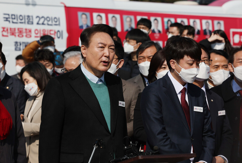 15일 윤석열 국민의힘 대선 후보가 남원에서 지지자들을 만나고 있다. 연합뉴스
