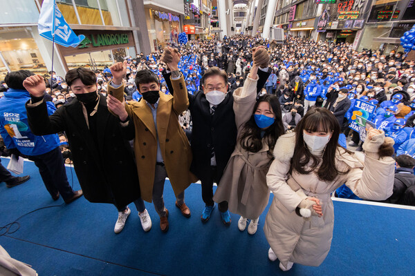 이 후보는 서울 강남 고속버스터미널에서 광주·전남과 전북에서 각각 유세활동을 벌이던 이낙연 총괄선대위원장과 정세균 전 총리 등과 ‘원팀 유세’를 벌였다. 이 후보는 이 자리에서 경선에 함께 뛰었던 이 위원장과 정 전 총리, 추미애 전 법무부 장관, 박용진 의원에게 직접 파란 목도리를 둘러줬고, 이 위원장은 이 후보에게 목도리를 둘러준 뒤 양쪽 어깨를 꽉 잡으며 북돋아줬다.