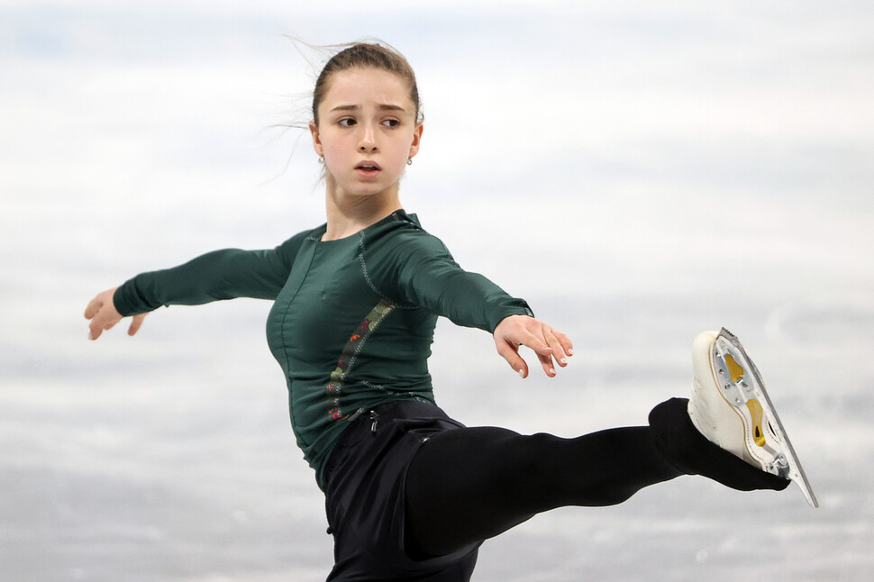 여자 피겨의 신성에서 여제 등극을 꿈꾸는 러시아올림픽위원회(ROC)의 카밀라 발리예바가 14일 오후 중국 베이징 캐피털 실내경기장 연습링크에서 열린 공식 훈련에서 쇼트프로그램 동작을 연습하고 있다.
