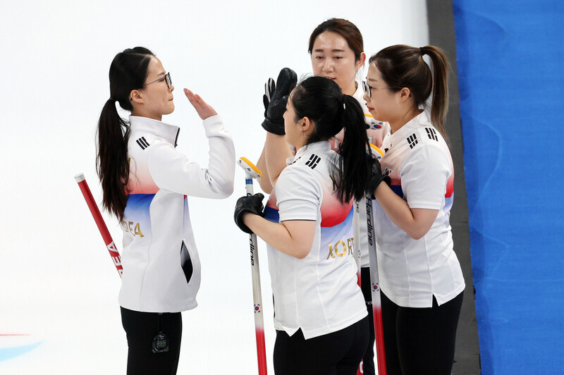 팀 킴이 14일 중국 베이징 국립 아쿠아틱센터에서 열린 2022 베이징겨울올림픽 컬링 여자 단체전 8엔드가 끝난 뒤 하이파이브를 하고 있다. 베이징/연합뉴스