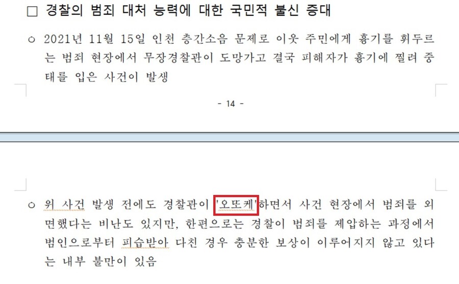 윤 후보는 지난 14일 사법제도 개혁 공약을 발표하면서 “경찰의 범죄 대처 능력에 대한 국민적 불신이 증대했다”며 “경찰 인사 개혁와 처우 개선을 통해 치안 역량을 강화하겠다”고 약속했다. 국민의힘은 이런 사법분야 개혁 공약에 대한 보도 참고자료(15쪽)에서 지난해 11월 인천의 층간소음 갈등 사건에서 무장경찰관이 대처하지 못해 피해자가 흉기에 찔린 사건을 언급하며 “위 사건 전에도 경찰관이 ‘오또케’하면서 사건 현장에서 범죄를 외면했다는 비난도 있지만, 한편으로는 경찰이 범죄를 제압하는 과정에서 범인으로부터 피습받아 다친 경우 충분한 보상이 이루어지지 않고 있다는 내부 불만이 있다“고 설명했다. ‘오또케’는 ‘어떡해’를 다르게 적은 것으로, 주로 여성 경찰들이 범죄 현장에서 ‘어떡해’만 남발한다고 비하하며 쓰는 표현인데, 국민의힘이 공약집 참고자료에서 이를 사용한 것이다.
