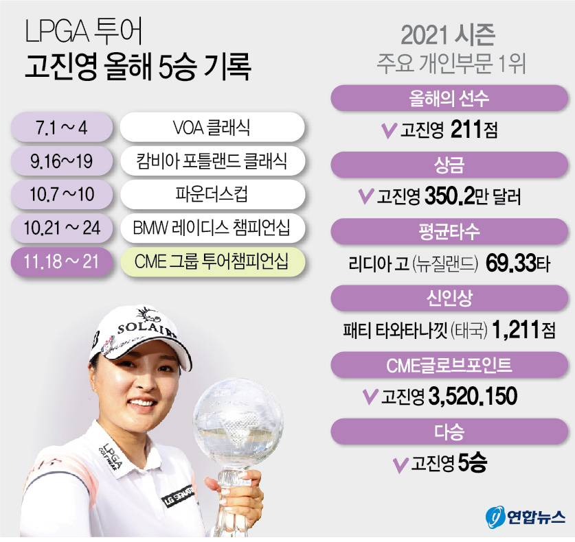 고진영은 21일 막을 내린 최종전 CME그룹 투어 챔피언십을 포함해 시즌 5승을 거둬 상금왕, 올해의 선수, 한 해 성적을 포인트로 환산한 CME 글로브 레이스를 석권해 주인공으로 빛났다.