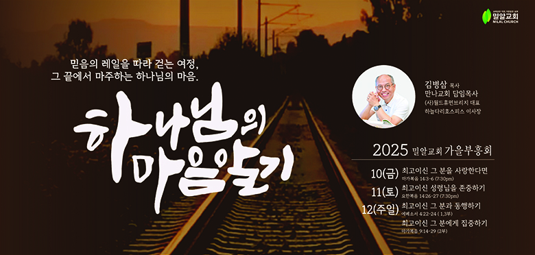 밀알교회(담임 박형일 목사: 405 Gordon Baker Rd.North York, M2H 2S6)는 2025 가을 부흥회를 10월10일(금)부터 12일 주일까지 김병삼 목사(만나교회 담임)를 강사로 개최한다.