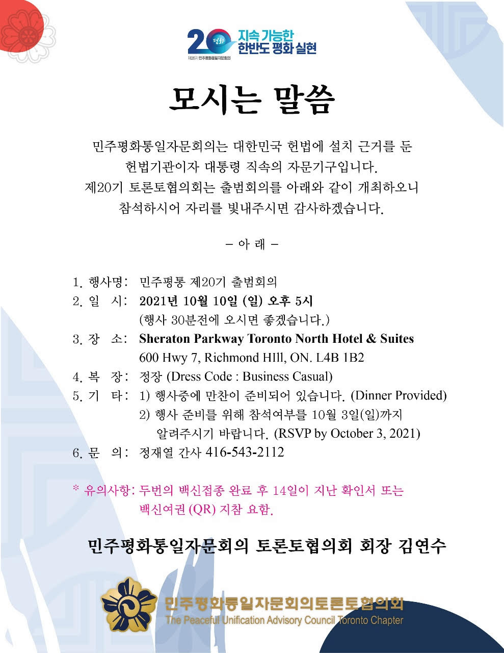 민주평통 토론토협의회가 10월10일(일) 오후 5시 리치몬드힐 쉐라톤 파크웨이 호텔(600 Highway 7, Richmond Hill)에서 제20기 출범식을 갖는다.