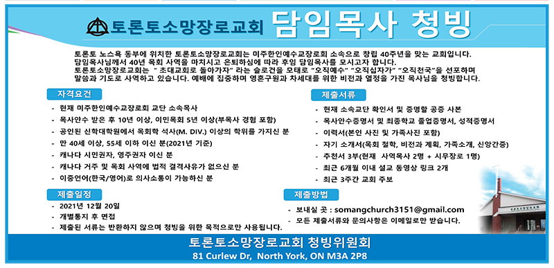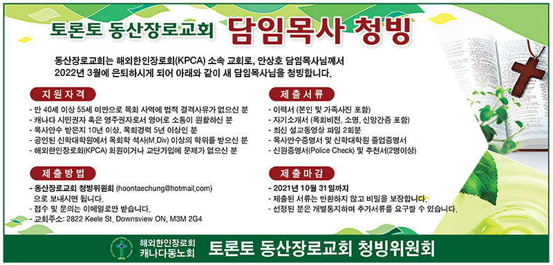 해외한인장로회(KPCA) 캐나다 동노회 소속 동산장로교회(담임 안상호 목사: 2822 Keele St, Dowensview M3M 2G4))가 후임 담임목사 청빙공고를 내고 오는 10월31일 주일까지 서류접수를 받는다고 밝혔다.