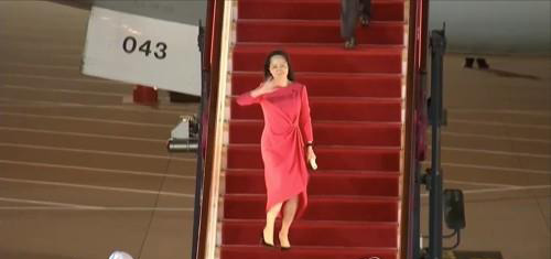 중국 중앙TV 화면에 따르면 붉은색 원피스 차림의 멍 부회장은 마치 국빈 방문한 외국 정상처럼 공항 활주로에서 트랩(이동식 계단)을 타고 전세기에서 내려와 중국 국기를 흔들며 기다리고 있던 시민들과 취재진 앞에서 성명을 낭독했다.