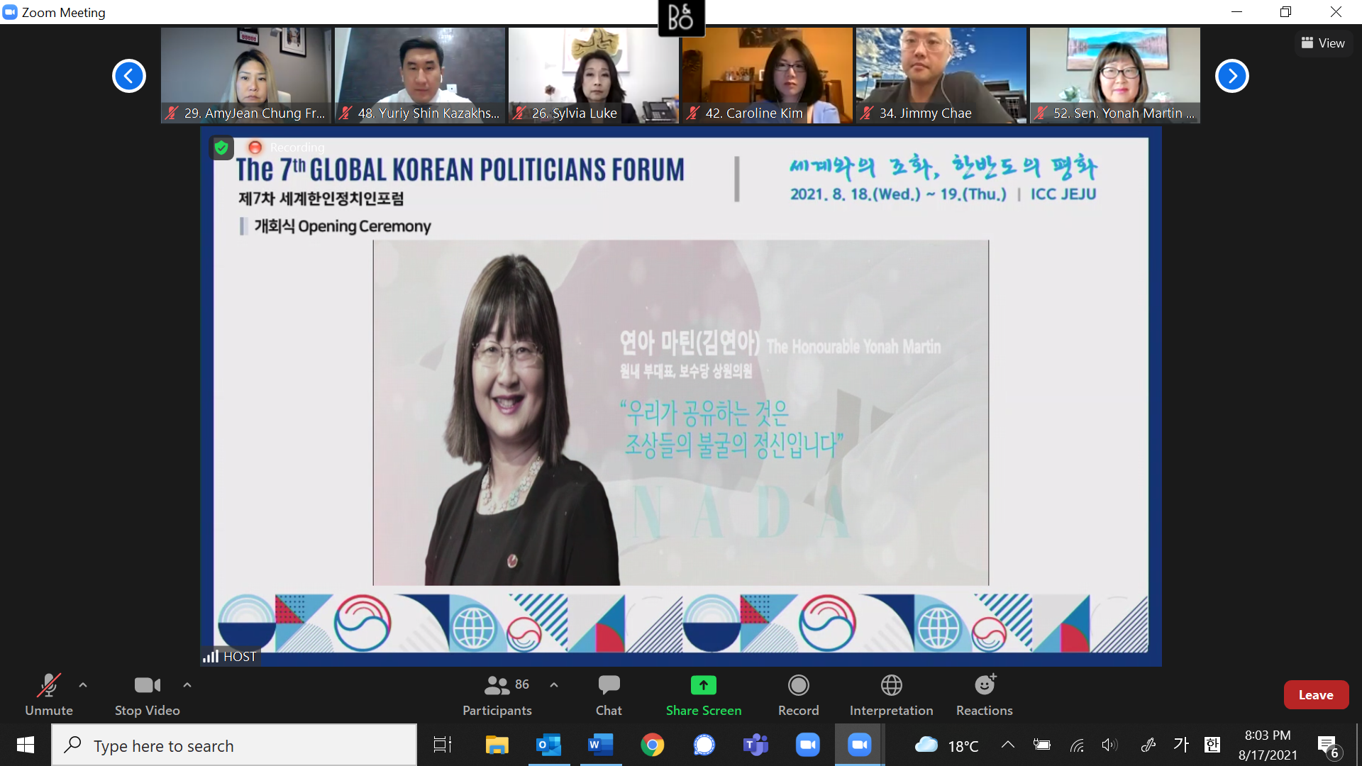 연아 마틴 의원은 지난 8월18~19일 모국 제주도에서 대면행사와 온라인 화상회의를 겸해 열린 제7차 세계 한인 정치인포럼에서 전임 신디 류 미국 워싱턴주 하원의원의 후임으로 4년 임기의 새 회장에 뽑혔다. 신디 류 전 회장은 지난 6년간 회장을 맡아오다 이번에 연아 마틴 의원에게 바톤을 넘겼다.