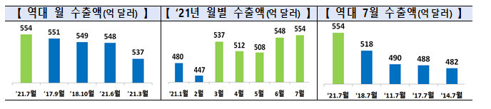1~7월 누계 수출액(3587억달러) 또한 역대 1위 실적이다. 지난해 같은 기간에 견줘 26.6% 늘어난 수준으로, 2010년(1~7월) 이후 11년 만에 최대 증가율이다. 앞서 올해 상반기 수출은 지난해 같은 기간보다 26.1% 늘어난 3032억4천만달러를 기록한 바 있다. 상반기 기준 역대 최고 실적이며, 증가율도 2010년 상반기(34.3%) 이후 11년 만에 가장 큰 폭으로 늘어난 수준이었다.