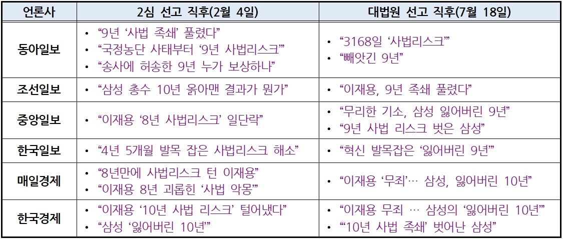 신문의 경우 경향신문과 한겨레는 "대법, 이재용 무죄 확정"(경향신문), "부당합병 등 혐의 이재용 무죄 확정"(한겨레)으로 사실위주 제목을 썼지만 다른 신문은 그렇지 않았습니다. 주로 2016년 국정농단 사건 이후 이재용 회장이 검찰 수사와 재판에 임한 기간을 강조하며 자극적인 제목을 썼습니다. "3168일 '사법리스크'"(동아일보), "빼앗긴 9년"(동아일보), "이재용, 9년 족쇄 풀렸다"(조선일보), "무리한 기소, 삼성 잃어버린 9년"(중앙일보), "9년 사법 리스크 벗은 삼성"(중앙일보), "혁신 발목잡은 '잃어버린 9년'"(한국일보), "이재용 '무죄'… 삼성, 잃어버린 10년"(매일경제), "이재용 무죄… 삼성의 '잃어버린 10년'"(한국경제), "'10년 사법 족쇄' 벗어난 삼성"(한국경제)과 같이 말입니다.
