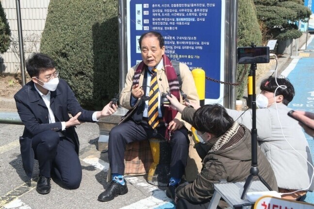 윤석열 전 검찰총장의 장모 최아무개씨를 고발한 사업가 노아무개씨가 지난해 3월 경기 의정부지검 앞에서 기자들의 질문에 답하고 있다. <연합뉴스>