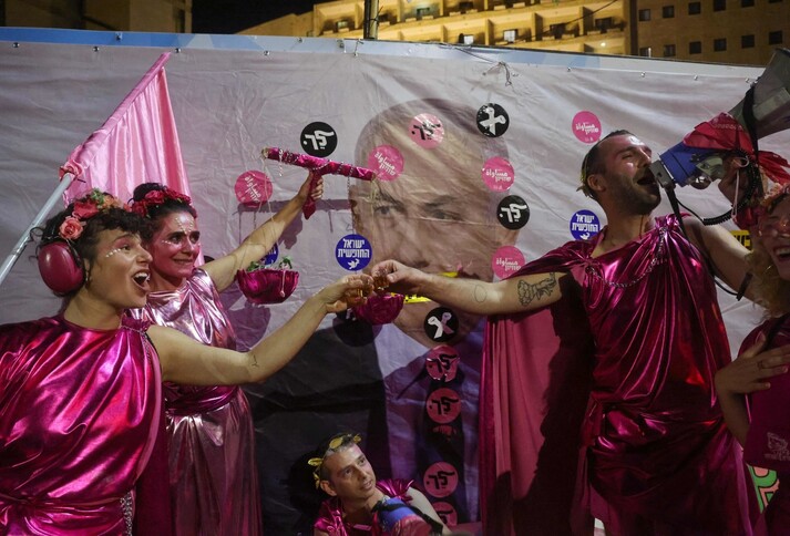 이스라엘에서 새 연정 구성으로 베냐민 네타냐후 총리의 15년 장기집권이 끝날 것이 거의 확실해진 12일(현지시각), 예루살렘 네타냐후의 거처 앞에서 시위대가 축하의 건배를 하고 있다. 예루살렘/AFP 연합뉴스