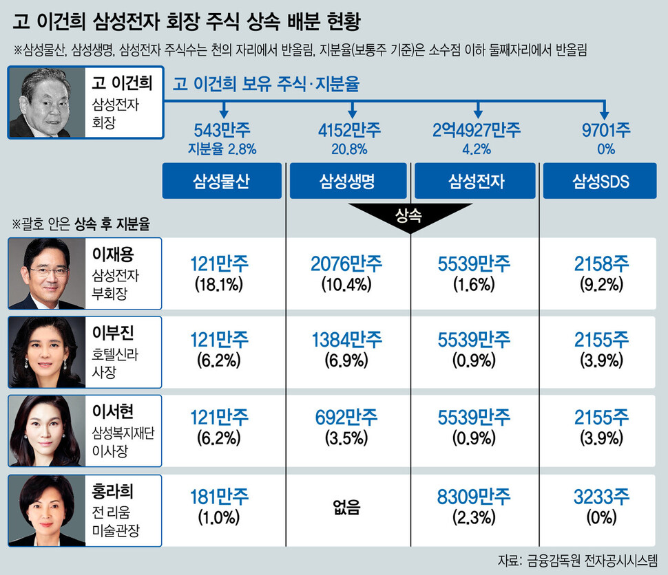 고 이건희 삼성전자 회장의 유산 중 가장 큰 몫인 삼성전자 지분이 법정상속 비율대로 부인인 홍라희씨와 이재용·이부진·이서현 세 남매에게 돌아갔다. 삼성생명 지분은 장남인 이재용 삼성전자 부회장이 절반을, 나머지는 동생들이 나눠 갖기로 했다.