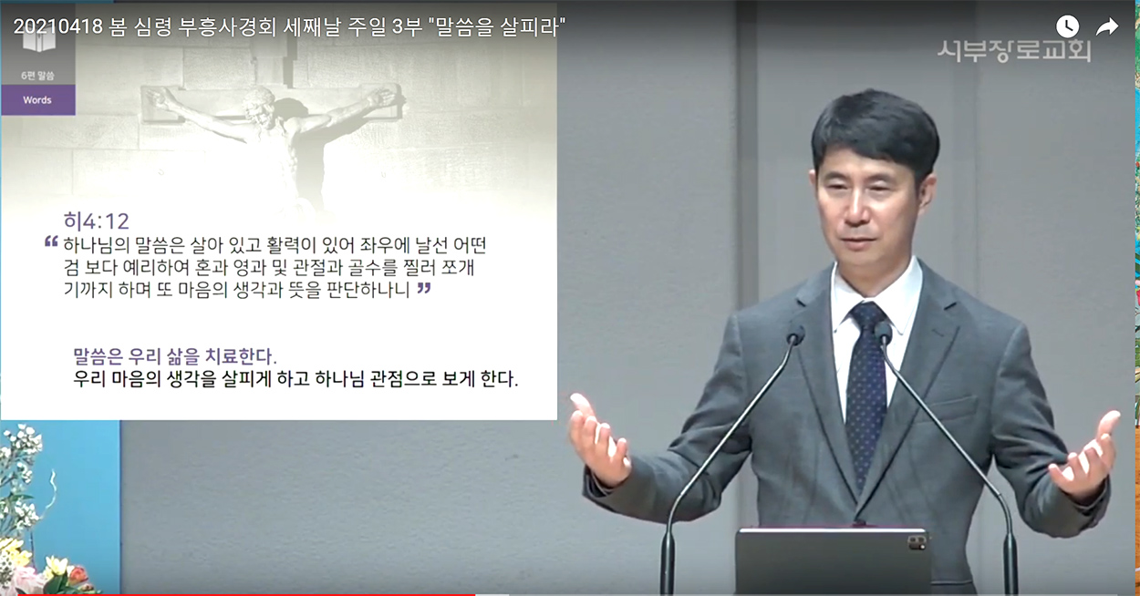 지난 4월16일부터 18일 주일까지 ‘각각 자기의 일을 살피라’(갈 6: 1~4)는 주제로 본당 대면집회와 온라인으로 진행된 사경회에서 최성열 목사는 첫날인 16일 저녁 ‘믿음을 살피라’(히 11: 6)는 말씀을 시작으로 ‘기도를 살피라’(딤전 2: 1~4), ‘예배를 살피라’(요 4: 24), ‘관계를 살피라’(엡 6: 1~4), ‘물질을 살피라’(고후 9: 6~9), ‘말씀을 살피라’(딤후 3: 14~17)라는 제목으로 6가지 분야별 ‘진단’기준과 방향을 제시하는 은혜로운 말씀을 전했다.