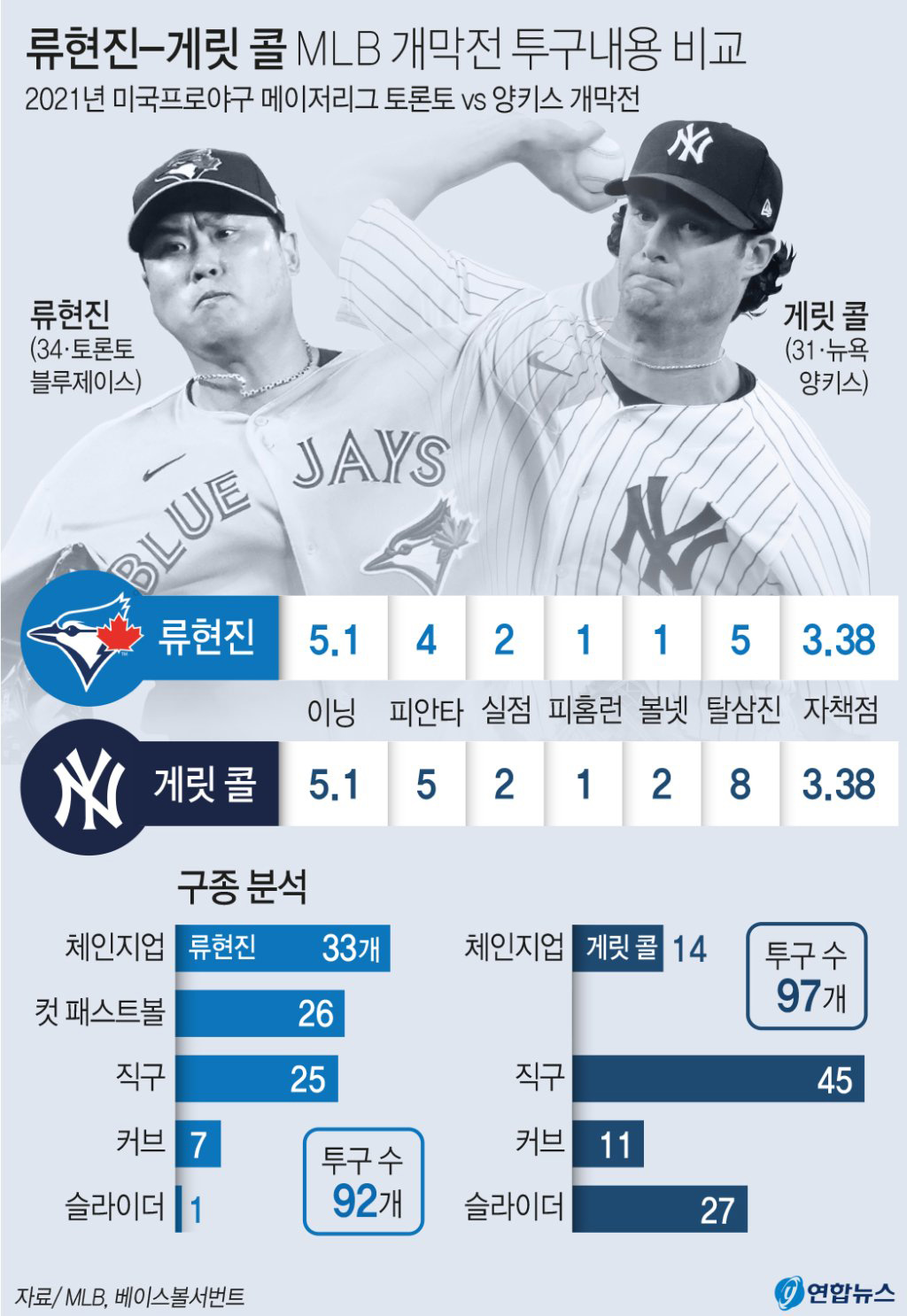 류현진(34·토론토 블루제이스)이 개릿 콜(31·뉴욕 양키스)과의 2021년 메이저리그 개막전 선발 맞대결에서 승패를 가리지 못했다.