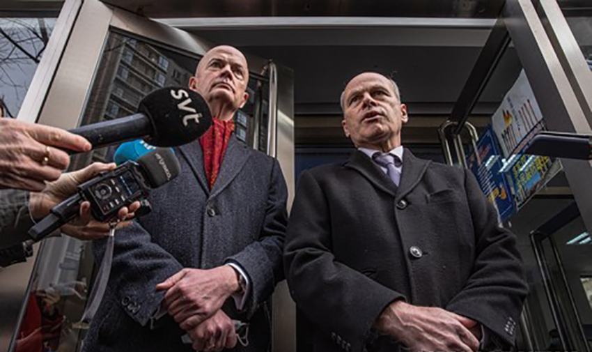 짐 닉켈(오른쪽) 주중 캐나다대사관 대사대리와 윌리엄 클라인 미국대사관 대사대리가 코브릭 재판이 열리는 베이징 법원 앞에서 취재진에게 말하고 있다. [EPA=연합뉴스]