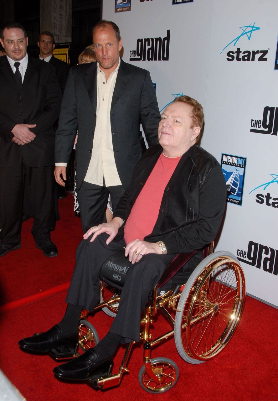 래리 플린트가 지난 2008년 할리우드의 한 극장에서 자신의 일대기를 그린 영화에서 자신으로 분한 배우 우디 해럴슨과 재회했다. AFP 연합뉴스