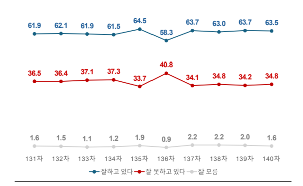 같은 기간 진행된 ARS 조사에서 국정운영 평가는 ‘긍정’ 63.5%(0.2%p↓), ‘부정’ 34.8%(0.6%p↑)로 집계됐다. ‘긍·부정’ 격차는 28.7%p로 나타났다.