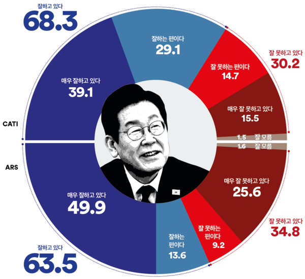 이재명 대통령의 국정운영 평가는 전화면접조사 기준 ‘긍정’ 68.3%, ‘부정’ 30.2%로 집계됐다. 지난 조사 대비 ‘긍정’ 평가는 1.2%p 하락했고 ‘부정’ 평가는 0.9%p 상승했다. ‘긍·부정’ 격차는 38.1%p로 국민 10명 중 약 7명이 대통령의 국정 수행을 긍정적으로 평가하는 것으로 나타났다.