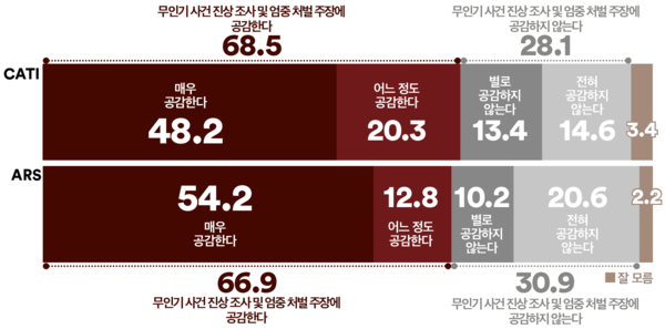 같은 기간에 진행된 ARS조사에서는 응답자 66.9%가 ‘공감한다’(‘매우 공감’ 54.2%+‘어느 정도 공감’ 12.8%)고 답했다. 반면 ‘공감하지 않는다’는 응답은 30.9%(‘별로 공감하지 않는다’ 10.2%+‘전혀 공감하지 않는다’ 20.6%)로 집계됐다.