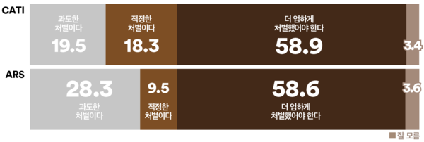 같은 기간 진행된 ARS조사에서도 응답자 58.6%가 ‘더 엄하게 처벌했어야 한다’고 답해 엄벌 여론이 과반을 넘긴 것으로 나타났다. 반면 ‘과도한 처벌’은 28.3%, ‘적정한 처벌’은 9.5%로 집계돼 ‘징역 5년은 부족하다’는 인식이 우세한 흐름으로 확인됐다. < 강기석 기자 >