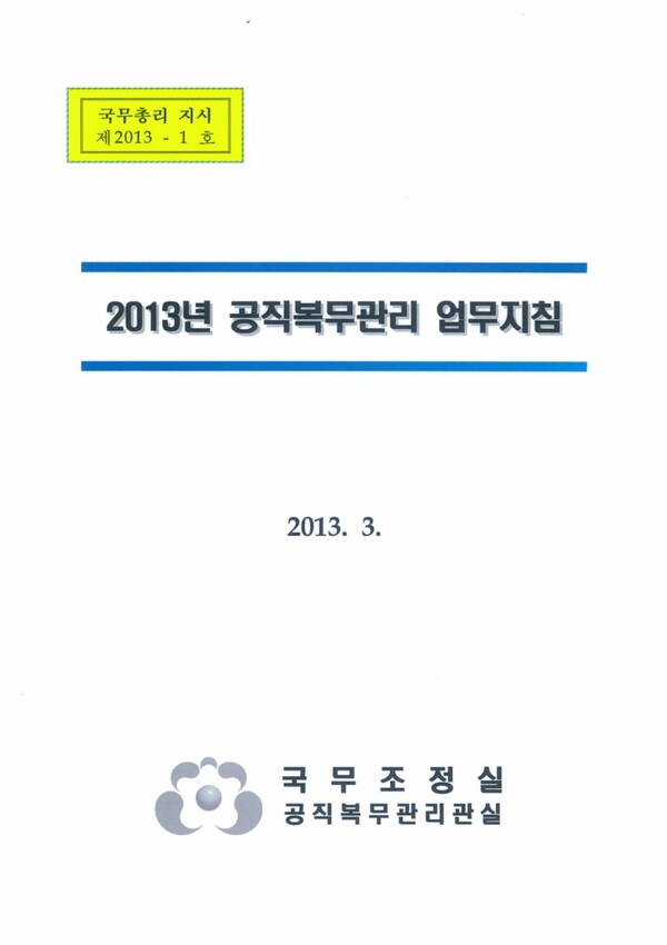 2013년 3월 하달한 국무총리 지시 제1호. 공직복무관리 업무지침 표지. 2024.11.22. 탐사보도그룹 워치독