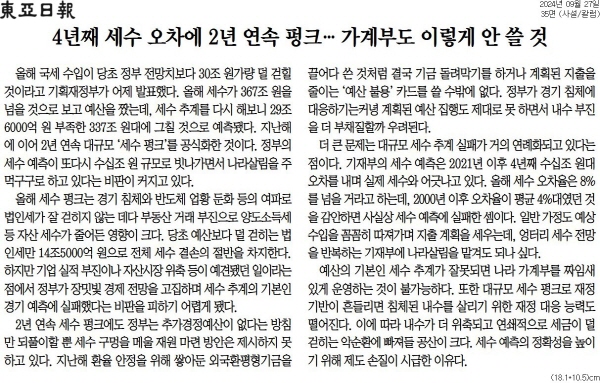 2년 연속 대규모 세수 결손이 발생하자 27일자 신문 대다수가 정부를 비판하고 나섰다. 동아일보는 “나라살림을 주먹구구로 하고 있다는 비판이 커지고 있다”며 “계획된 예산 집행도 제대로 못 하면서 내수 부진을 더 부채질할까 우려된다”고 했다.