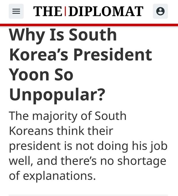 미국 외교 전문지 <더 디플로매트>는 '한국 윤석열은 왜 그리 인기가 없는가'란 13일 자 기사에서 이렇게 진단했다. 디플로매트는 "한국인 다수는 자국 대통령이 일을 잘못한다고 여기고 있다. (왜 그런지) 설명할 거리는 부족하지 않다"라면서 그 주된 요인 중 하나로 "윤석열의 언론 탄압"을 거론한 것이다.